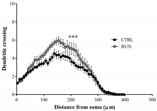 Sholl’s analysis of dentate gyrus GFP-positive neurons. Dendritic length measured by Sholl’s analysis (superimposed ring 8 μm) revealed an increase in arborization, particularly evident at distances between 115–227 μm from the soma in the RUN group. Data statistical analysis: multiple Student’s t-test, *** p < 0.001 from 115 to 227 µm. All data are expressed as mean ± SEM, CTRL n = 21, RUN n = 21.