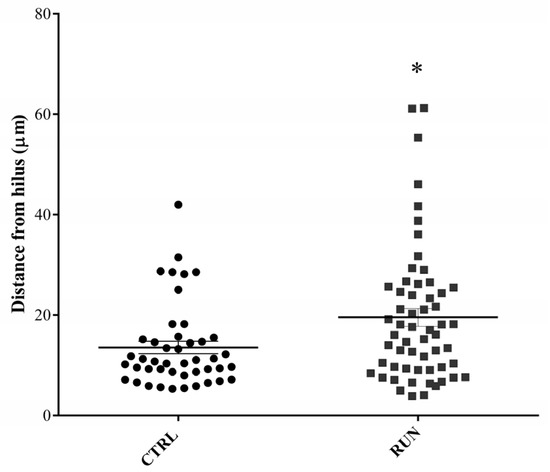 Along the DG granule differentiation process the adult-generated neurons migrate throughout the granule cell layer; thus, the distance of the GFP-positive cell body from the SGZ/hilus was calculated to gain further insight into the newborn granule maturation level under control and exercised conditions. From this evaluation, we found that new granule neurons of the RUN group were generally farther from the SGZ/hilus in comparison to the CTRL group (Figure 7).