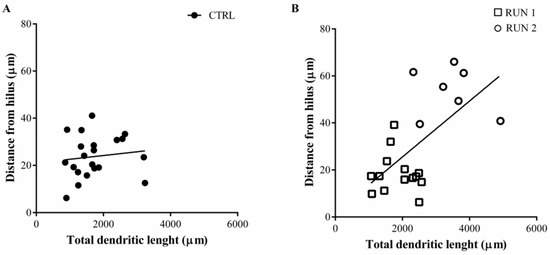 It is noteworthy that in plotting the cell body distance from the SGZ/hilus versus the dendritic length, it was possible to distinguish two separate populations of labeled cells in the RUN group that we named RUN1 and RUN2 (Figure 8B). The presence of subpopulations was not appreciable in the CTRL group (Figure 8A).