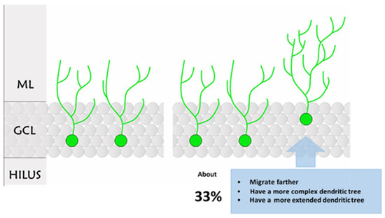 Hippocampal adult neurogenesis is a dynamic process highly dependent on the activity of the neural network. Therefore, consistently with the fact that DG receives various afferences from multiple brain regions, adult-born neuron development steps are regulated by numerous factors related to global and local neuronal activities. Voluntary physical exercise is one of the most studied activities able to positively influence adult neurogenesis. Neurogenesis improvement induced by physical activity [9,10] is considered able to maintain brain health; indeed, a large body of literature brings evidence about the beneficial consequences of physical and mental training on cognitive performance [11]. Molecular mechanisms underlying the effect of physical exercise on new neuron production are possibly related to many factors, such as BDNF [12,13], serotonin (5-hydroxytryptamine—5HT) [14,15,16], vascular endothelial growth factor (VEGF) or insulin-like growth factor-1 (IGF-1) [17,18,19,20,21].