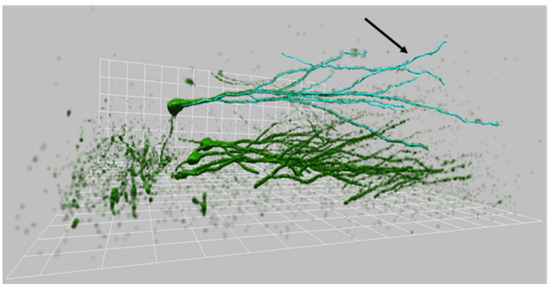 Three-dimensional reconstruction of granule cells. Three-dimensional reconstruction of 30-day-old GFP-positive granule cells performed using NeuronStudio software on confocal microscopy stacks. It is possible to notice the blue traces of dendrites (arrow) which spread through the three dimensions of the slice.