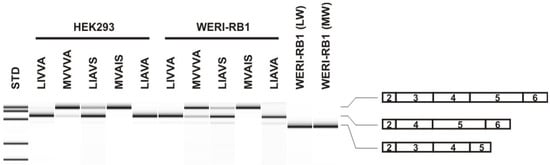 Bioanalyzer separation of RT-PCRs from HEK293 and WERI-Rb1 cells. RT-PCR products obtained with RNA from HEK293 and WERI-Rb1 cells transfected with different exon 3 minigene constructs were separated on a Bioanalyzer DNA-1000 chip. The exonic composition of the products is indicated on the right. RT-PCR products with RNA from non-transfected WERI-Rb1 cells showing expression and correct splicing of endogenous OPN1LW and OPN1MW transcripts were separated in comparison (lanes WERI-Rb1 (LW) and WERI-Rb1 (MW)). Note that different reverse primers were used for amplification of cDNA from minigene transfected cells (i.e., construct-specific reverse primers) and non-transfected WERI-Rb1 cells, which also results in fragment size differences. STD—Size Standard.