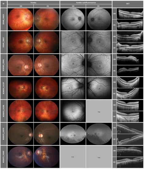 Morphological changes of the retinas in these patients were rather decent. Close to normal retinal layering was observed in OCT images and retinal appearance showed some degree of hypopigmentation and optic nerve head paleness. Because many of the patients had myopia, myopic changes such as peripapillary atrophy were present, too. Findings of macular atrophy, such as reported in affected adults by Orosz and colleagues [], were not observed in our cohort. There were only small changes in the perifoveal autofluorescence in our patients, reflecting probably a small degree of pigment epithelium changes in the area of the highest red (L) and green (M) cone density.