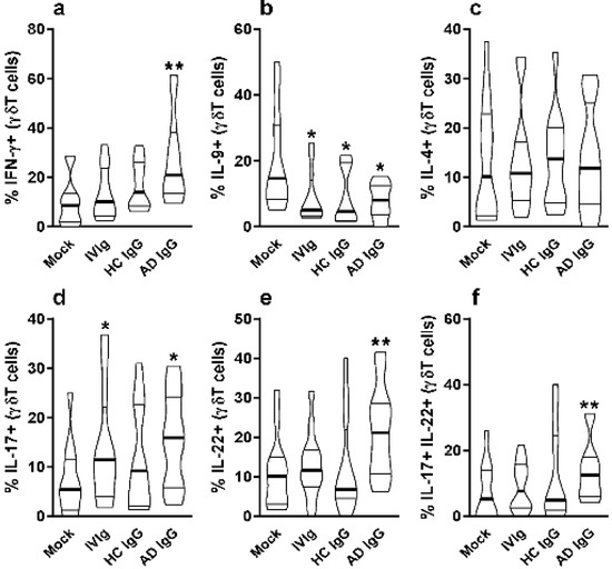 On the other hand, IL-9 production by γδT cells was inhibited by AD IgG, HC IgG, and IVIg compared to the mock condition (Figure 2b). There was no effect in γδT cell IL-4 production in any culture condition (Figure 2c). However, only AD IgG and IVIg were able to induce the IL-17-producing γδT cells when compared to the mock condition (Figure 2d), and only AD IgG was able to induce IL-22-producing γδT cells in comparison to the controls (Figure 2e). Due to the possibility of IL-17 and IL-22 coproduction by γδT cells, we also evaluated the frequency of double-positive (IL-17+IL-22+) γδT cells, and found that only AD IgG could induce a higher frequency of these cells compared to control conditions (Figure 2f).