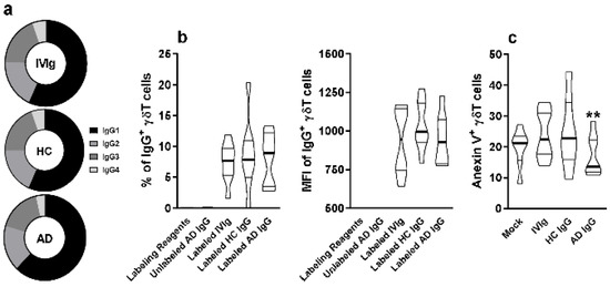 Evaluation of IgG subclass frequency and their direct interaction with thymic γδT cells. (a) Frequency of IgG1, IgG2, IgG3, and IgG4 isotypes in IVIg and purified AD IgG was evaluated. Thymocytes from children under 7 days old (n = 12) were incubated for 30 min with labeling kit reagents (Without IgG), unlabeled AD IgG, labeled IVIg, labeled HC IgG, or labeled AD IgG. (b) Frequency and (c) intensity of IgG staining (IgG+) or (c) frequency of Anexin V staining (Anexin V+) on thymic γδT (CD3+γδTCR+) cells. Pie charts represent the frequency of each IgG isotype within the total amount of detected IgG. Violin plots represents values distribution from minimum to maximum, thick lines represent quartiles, and bold lines represent the mean. ** p ≤ 0.05 when compared to the Mock, IVIg, and HC IgG conditions.