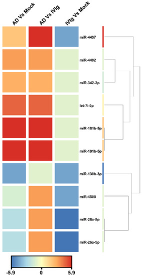 To identify miRNA expression signatures associated with thymocytes, we analyzed active miRNA expression profiles using the Illumina small RNA sequencing approach in three culture conditions: the absence of IgG (Mock), the therapeutic IgG formulation (IVIg), and the experimental condition with AD IgG. When we compared AD IgG with IVIg, sequencing analysis revealed nine overexpressed miRNAs that satisfied the Bonferroni-corrected value criterion (p ≤ 0.05) and the fold-change criterion (FC ≥ 2), showing considerable variation between AD IgG and IVIg controls (Figure 4). When AD IgG was compared to a mock condition, nine miRNAs were significantly dysregulated, with six and three miRNAs being over- and underexpressed, respectively (Figure 4). Lastly, the deep sequencing approach identified five miRNAs underexpressed in response to IVIg compared to the mock condition (Figure 4). Hierarchical clustering based on the significantly dysregulated miRNAs showed a clear separation between AD IgG and control conditions. hsa-miR-4497 and hsa-miR-181b-5p (fold changes, 9.5 and 6.17, respectively) were the most upregulated miRNAs, and hsa-miR-130b-3p was the most downregulated in response to AD IgG when compared to the mock condition (fold change, 4.5).