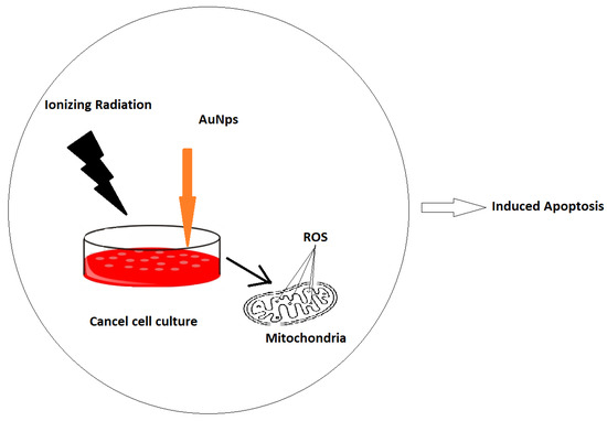 Mitochondria are responsible for programmed cell death, so if it is stressed, it can lead to cell death. Many of the reactions involved in cellular respiration happen in the mitochondria. We demonstrated the induction of ROS production in two different cancer cells in response to the ionizing radiation-induced stress and AuNps in combination. Mitochondria are affected by irradiation and gold nanoparticles in combination which causes malfunctioning mitochondria and eventually leads to cell death. Results indicate that the effect of radiations and AuNps increases up to 4 Gy in mitochondria, and by increasing the dose beyond this value, it drops down. We can conclude around 4 Gy is the optimal dose for cell damage through mitochondria and higher than 4Gy cell death happens in different ways. Following other references, we believe up to 4 Gy, the ratio of mitochondrial damage is rising, but after 4 Gy, other organelles play a role in cell damage, and the effect of mitochondria is reduced. This conclusion can back up with other references. However, further investigation into this matter is beyond the objective of this study.