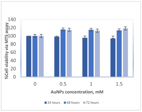 The MM418-C1 and DU145 cell lines were treated with biocompatible 1.9-nanometre AuNPs in solution at concentrations ranging from 0 to 1.5 mM for 24, 48, and 72 h, in order to determine the reactions and tolerance levels of the treated cell lines to the AuNPs in the absence of radiation. Cell viability was measured using an MTS assay and was reported as a ratio of the optical absorbance of the AuNP-treated groups to control groups (with no AuNPs) at the same time point [13]. As shown in Figure 2, the addition of AuNPs to cells did not significantly impact the viability of cells: the AuNPs are not toxic to either cell line at all tested concentrations. The DU145 cells exhibit the typical response visible after 48 h, followed by stimulated recovery at 48–72 h. In Figure 3, we see that the response of both cell lines is similar, as shown for the 48-hour time point. The NP concentration selected for the remainder of the study was 1 mM.