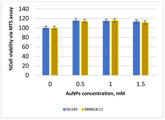 Comparison of cell viability (MTS assay) for DU145 and MM418-C1 cell lines 48 h after being treated with various concentrations of AuNPs. Data are represented as mean values ± SD of three replicate samples.