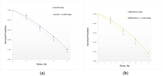 Cell survival curves quantifying the net 6-megavolt radiation dose enhancement caused by the impact of AuNPs on two cancer cell lines: (a) DU145, and (b) MM418-C1, both with and without AuNPs. Data are represented as mean values ± SD of three replicate samples.