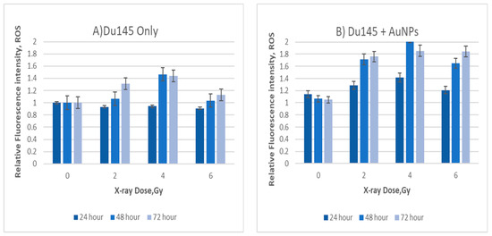 Relative mitochondrial ROS levels in DU145 cells after irradiation (A) without AuNPs and (B) with AuNPs. Cells were exposed to doses from 0 to 6 Gy. Data are represented as mean values ± SD of three replicate samples.