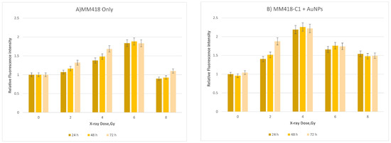 Relative mitochondrial ROS levels in MM418-C1 cells after irradiation (A) without AuNPs and (B) with AuNPs. Cells were exposed to doses from 0 to 8 Gy. Data are represented as mean values ± SD of three replicate samples.