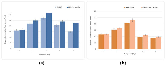 The pattern of OCR in the two types of cancer cells in response to the ionising radiation-induced and NP-induced stress was measured using the MitoStress Kit, which directly measures the activity of electron transport chains in mitochondria. Most of the reactions involved in cellular respiration occur in the mitochondria. If mitochondria are injured, they generally consume more oxygen [29,30]; taking more oxygen generates more ROS. As seen in Figure 7, part a, ionising radiation caused a significant increase in the OCR levels at a dose of 4 Gy. Similarly in MM418-C1 cells, the highest OCR is at 4-Gy; and once the dose is increasing, OCR decreases.