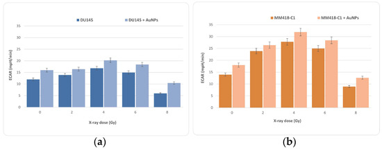 As a compensatory response, an increase in glycolysis is frequently observed. Mitochondria are required for cell energy metabolism, and play an important role in cell death. Mitochondrial failure can be caused by changes in mitochondrial respiration or the balance of pro-apoptotic and anti-apoptotic proteins [16]. During the same measurement period, the change in proton concentration was also measured against time in order to determine the extracellular acidification rate (ECAR), predominantly a measure of lactic acid formed during aerobic glycolysis (Figure 8). A low and stable ECAR value was observed during the basal measurement period for the same experiment. Upon introducing oligomycin, a rapid increase in ECAR was observed, reflective of increased glycolytic metabolism due to the inhibition of ATP synthase. We can see similar results to OCAR in the ECAR calculation as well. Like OCR, ECAR increases with dose to a maximum at or near 4 Gy before decreasing at higher doses of 6 and 8 Gy. The results for the MM418-C1 cells showed a much stronger ECAR effect than that for DU145, indicating that MM418-C1 clearly switched to glycolysis.