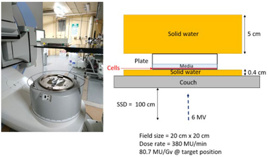 The cells were irradiated with 6-megavolt X-ray beams generated by a medical linear accelerator (LINAC) (Elektra Synergy, Stockholm, Sweden) located at the Australian Radiation Protection and Nuclear Safety Agency (ARPANSA), Yallambie, Australia. The radiation was delivered as a single fraction for each dose, i.e., 0 Gy for control groups, and from 2 to 8 Gy for treated groups. The given dose was measured from calculations using an ion chamber before cell irradiation. All experimental plates were uniformly exposed to IR; since the cell lines used for this study are adherent, a monolayer of cancer cells forms at the bottom of the 6-well plates. A water-equivalent layer with a thickness of 4 cm placed on top of the plates provided sufficient backscatter radiation to achieve as much electric equilibrium as possible, as shown in Figure 9.