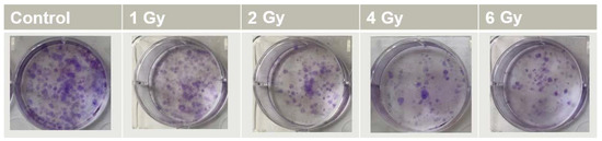 Clonogenic assay was the technique we used for plotting the cell survival curves [14]. According to the radiation dose, various numbers of cells (Table 1) were seeded in 6-well plates, and cells were incubated for 24 h at 37 °C with 5% CO2 in a humidified environment. Cells were treated with 0.5 mM of AuNPs, and were then incubated for 24 h. We renewed the culture medium before irradiation was administered. Cells were incubated for 14 days in order to produce colonies containing about 50 cells. After this incubation time, cell colonies were fixed in (3:1) methanol/acetic acid for 5 min and stained with 0.5% crystal violet. The stained cell colonies were gently rinsed with water and allowed to dry for 24 h (Figure 10). The number of colonies was manually counted using ImageJ software [35].