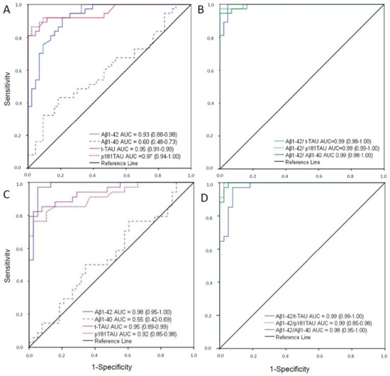 Receiver operating characteristic (ROC) curve and area under the curve (AUCs) were calculated and plotted for every biomarker (Aβ1-42, Aβ1-40, t-Tau, and p181Tau) and ratio (Aβ1-42/Aβ1-40, Aβ1-42/t-Tau, and Aβ1-42/p181Tau). Cutoffs for each single biomarker and the ratios were selected from the ROC curve coordinates according the highest Youden J index (Sensitivity + Specificity − 1).