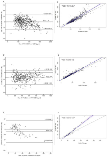 Bland–Altman (A,C,E) and Passing–Bablok analysis (B,D,F) for Aβ42, hTAU, and p181TAU biomarkers comparing CLEIA with ELISA assay for Aβ1-42 (n = 519), for t-Tau (n = 399), and for p181Tau (n = 77). For Bland–Altman analysis, the solid line shows 0 or no difference, while the dotted line shows the mean difference ± 1.96 standard deviation (SD). For Passing–Bablok analysis, dotted lines represent the equation x = y (identity line) and the blue areas show the 95% CI of the regression lines. Abbreviations: CLEIA, ELISA.