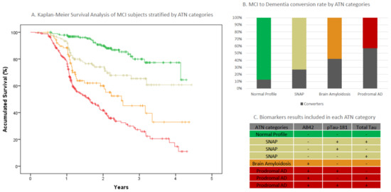 - Van Maurik, I.S.; Vos, S.J.; Bos, I.; Bouwman, F.H.; Teunissen, C.E.; Scheltens, P.; Barkhof, F.; Frolich, L.; Kornhuber, J.; Wiltfang, J.; et al. Biomarker-based prognosis for people with mild cognitive impairment (ABIDE): A modelling study. Lancet Neurol. 2019, 18, 1034–1044. [Google Scholar] [CrossRef]