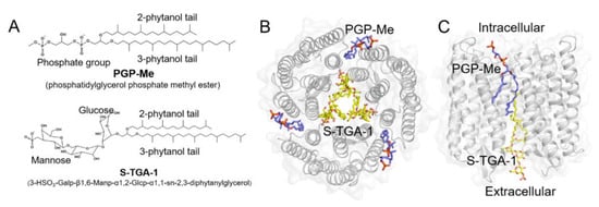 Schematic diagram of the structures of S-TGA-1, PGP-Me, and the bacteriorhodopsin (bR) trimer. (A) Molecular structures of S-TGA-1 and PGP-Me; (B,C) top and front view for the locations of S-TGA-1 (yellow sticks) and PGP-Me (dark blue sticks) within the bR trimer (grey cartoon).