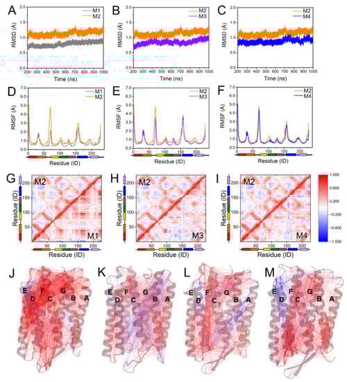 The influence of S-TGA-1 and PGP-Me on the dynamic stability of the bR trimer. (A–C) Time evolutions of the root mean square deviation (RMSD) of the Cα atoms during the simulations. (A) M1 (bR trimer with POPC, S-TGA-1, and PGP-Me, grey line) vs. M2 (bR trimer with POPC only, orange line); (B) M3 (bR trimer with POPC and S-TGA-1, purple line) vs. M2; (C) M4 (bR trimer with POPC and PGP-Me, blue line) vs. M2; (D–F) time evolutions of root mean square fluctuations (RMSF) of the Cα atoms: (D) M1 vs. M2; (E) M3 vs. M2; (F) M4 vs. M2; (G–I) dynamic cross-correlated map (DCCM) analyses of the Cα atoms; (G) M1 vs. M2; (H) M3 vs. M2; (I) M4 vs. M2. The upper left triangle represents M1. The color scale represents the correlation intensity from the maximum negative value (−1) to the ultimate positive value (+1); (J–M) dynamic cross-correlation network (DCCN) analyses of residue–residue cross-correlations from M1 to M4. The grey cartoon represents the bR structure of Monomer1 (one of the three monomers in the bR trimer), and blue and red lines indicate the negatively and positively correlated motions, respectively.