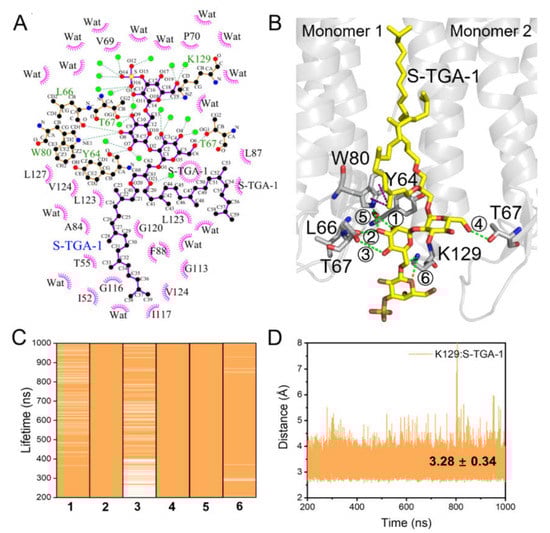 Schematic representation of S-TGA-1 binding to the bR trimer. (A) The LigPlot+ diagrams of the S-TGA-1 binding sites from the last snapshot of M1; the green dotted lines and the pink spoked arcs represent hydrogen bond (H-bond) and hydrophobic interactions, respectively; (B) the possible H-bond (green dotted line) and Pi–alkyl hydrophobic interactions (purple dotted line) between S-TGA-1 with bR. Monomer1 and Monomer2 represent the two adjacent monomers in the bR trimer. The grey sticks represent the interacting residues, and the yellow sticks represent S-TGA-1; (C) evaluation of the lifetimes of the H-bond interactions for S-TGA-1; see (B) for the description of the numbers: (1) Y64∙∙∙2-hydroxyl of mannose; (2) L66∙∙∙2-hydroxyl of mannose; (3) T67∙∙∙3-hydroxyl of mannose; (4) T67∙∙∙6-hydroxyl of glucose; (5) W80∙∙∙2-hydroxyl of mannose; (6) K129∙∙∙ether group of galactosyl-3-sulfate; (D) time evolution of the distance between K129 and the galactosyl-3-sulfate of S-TGA-1. These interaction modes were reproducible in the second time-repeating simulation, as shown in Figures S3 and S4.