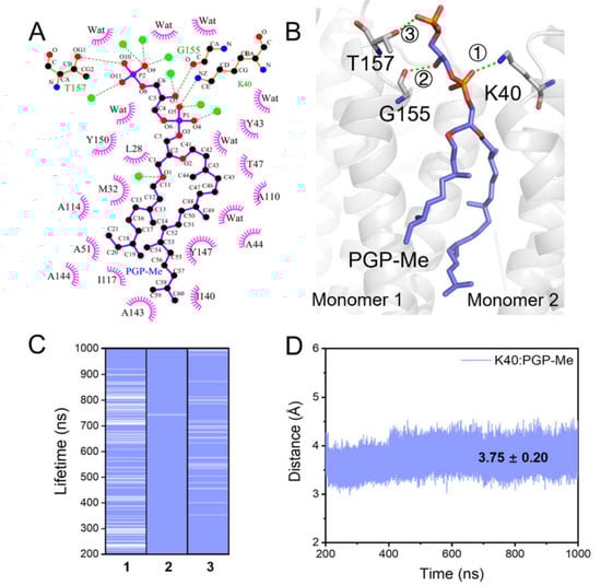 Schematic representation of PGP-Me binding to the bR trimer. (A) The LigPlot+ diagrams of the PGP-Me binding sites from the last snapshot of M1; the green dotted lines and the pink spoked arcs represent H-bond and hydrophobic interactions, respectively; (B) the possible H-bond interactions (green dotted line) between PGP-Me and the two adjacent monomers in the bR trimer. The grey sticks represent the residues interacting with PGP-Me via H-bond, and the dark-blue sticks represent PGP-Me; (C) evaluation of the lifetimes of the H-bond interactions for PGP-Me; see (B) for the description of the numbers: (1) K40∙∙∙O5 of the phosphate group; (2) G155∙∙∙O7 of the phosphate group; (3) T157∙∙∙O10 of the phosphate group; (D) the evolution of the distance between K129 and the galactosyl-3-sulfate of S-TGA-1. These interaction modes were reproducible in the second time-repeating simulation, as shown in Figures S3 and S4.