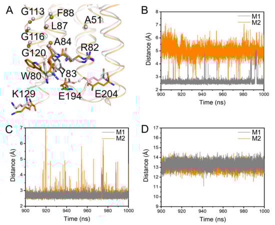 Further analysis of M1 revealed that the interactions between E194 and E204, the two crucial residues for proton release, were perturbed by S-TGA-1. In the presence of S-TGA-1, our simulations showed that E194 and E204 are close enough to form a “Glu-shared” model to cast the proton between them for effective proton release (Figure 5A,B and Table S3), as reported previously [,,,,]. Previous studies showed that A51 is stationary during simulations [], so the distance from A51 to R82 can be used to monitor R82 movement during the photocycle. It is clear that R82 couples with the retinal binding pocket in dark-adapted bR and affects the proton release complex (PRC) for proton release in the M state []. Thus, we may be able to indirectly investigate the influence of S-TGA-1 on E194 and E204 through the distance changes from Y83 to E194 and from A51 to R82. Interestingly, the distances from Y83 to E194 and from A51 to R82 were not much different in M1 and M2 (Figure 5C,D and Table S3), but there were apparent displacements of both W80 and Y83 on helix C towards E204 (Figure 5A), implying that the displacements of W80 and Y83 have an impact on E194∙∙∙E204 packing. Such shifts may originate from W80’s pi–alkyl hydrophobic interaction with S-TGA-1. In addition, R134 has H-bond interactions with T128 on the D-E loop, E194 on the F-G loop, and K129 on the D-E loop to produce cascade perturbations on the F-G loop [,]. Therefore, it is worth considering whether the interaction of K129 with S-TGA-1 also affects the “Glu-shared” model. To elucidate the underlying molecular mechanism of how W80∙∙∙S-TGA-1 and K129∙∙∙S-TGA-1 specific interactions regulate the proton release, we constructed simulations on W80A (M5, the membrane containing the W80A-bR trimer, POPC, S-TGA-1, and PGP-Me lipids) and K129L (M6, the membrane containing the K129L-bR trimer, POPC, S-TGA-1, and PGP-Me lipids) mutations.