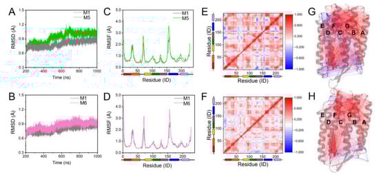 The influence of the W80∙∙∙S-TGA-1 and K129∙∙∙S-TGA-1 interactions on the dynamic stability of the bR trimer. (A,B) Time evolutions of the RMSDof the Cα atoms during the simulations; (A) M1 (grey line) vs. M5 (membrane containing the W80A-bR trimer, POPC, S-TGA-1, and PGP-Me lipids, green line); (B) M1 vs. M6 (membrane containing the K129L-bR trimer, POPC, S-TGA-1, and PGP-Me lipids, pink line); (C,D) time evolutions ofRMSF of the Cα atoms: (C) M1 vs. M5; (D) M1 vs. M6; (E,F) DCCM analyses of the Cα atoms for M5 and M6. The color scale represents the correlation intensity from the maximum negative value (−1) to the ultimate positive value (+1); (G,H) DCCN analyses of residue–residue cross-correlations for M5 and M6. The grey cartoon represents the bR structure of Monomer1, and blue and red lines indicate the negatively and positively correlated motions, respectively.