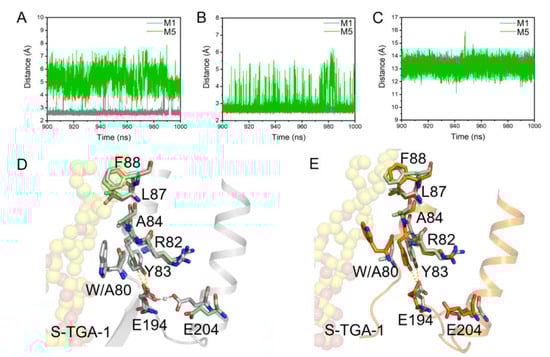Dynamic conformation changes of the key residues on the extracellular side of bR induced by the W80A mutation. (A–C) The evolution of the distance between the key residues from the last 100 ns simulations of M1 (grey line) and M5 (green line): (A) E194-E204; (B) Y83-E194; (C) R82-A51. This behavior could be reproduced in the second time-repeat simulation (Figure S8 and Table S4); (D,E) superimposed drawing of several key residues on the extracellular side: (D) M1 (grey cartoon and sticks) vs. M5 (pale green sticks); (E) M2 (orange cartoon and sticks) vs. M5. Yellow spheres highlight S-TGA-1.