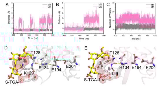 Dynamic conformational changes of the key residues on the extracellular side of bR induced by the K129L mutation. (A,B) The evolution of the distance between the key residues from the last 100 ns simulations of M1 (grey line) and M6 (pink line): (A) E194-E204; (B) R134-E194; (C) time series of the number of water molecules around K/L129 and T128 in the last 100 ns simulations of M1 (grey line) and M6 (pink line). This behavior could be reproduced in the second time-repeat simulation (Figure S11 and Table S5); (D,E) schematic diagrams of the H-bond network connecting K129 and the proton release complex (PRC) in M1 (D) and M6(E). The grey cartoon and sticks were used for M1, pink cartoon and sticks were used for M6, yellow sticks represent S-TGA-1, red spheres, and the transparent surface indicates the water chains around K129 and T128, respectively. The pink dotted lines show unstable H-bond interactions.