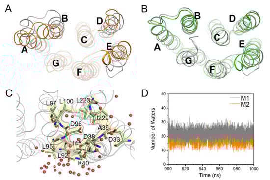 Dynamic changes in helices and water molecules on the cytoplasmic surface by the PGP-Me. (A) Superimposed drawing of the cytoplasmic side protein conformation of M1 (grey cartoon) and M2 (orange cartoon); (B) M1 and the late M state crystal structure of bR (PDB ID: 1FBB, green cartoon); (C) schematic diagram of the distribution of water molecules on the cytoplasmic surface from the last snapshot of M1. Red spheres represent the water molecules. D96 is surrounded by the key residues, especially hydrophobic ones (green stick and yellow surface). More water molecules gather around these residues, making it more accessible for them to enter the protein efficiently during the M state; (D) time series of the number of water molecules near the cytoplasmic surface in the last 100 ns simulations of M1 (grey line) and M2 (orange line).