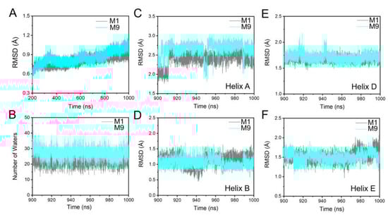 Dynamic changes in the helices and water molecules caused by the K40L mutation. (A) Time evolution of RMSD of the Cα atoms during the simulation of M1 and M9 (membrane of the K40L-bR trimer with POPC, S-TGA-1, and PGP-Me); (B) time series of the number of water molecules near the cytoplasmic surface in the last 100 ns simulations of M1 and M9; (C–F) the RMSD of the cytoplasmic end of helices A (C), B (D), D (E), and E (F) in M1 and M9 in a late M-state crystal structure (PDB ID: 1FBB). A smaller RMSD indicates a larger opening. Grey and cyan indicate the M1 and M9, respectively.
