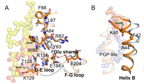 Schematic flowchart of the effects of S-TGA-1 (A) and PGP-Me (B) on the extracellular and cytoplasmic surfaces of bR. Yellow and light-blue spheres represent S-TGA-1 and PGP-Me, respectively. Grey and orange sticks indicate the regional conformation of bR and lipids in M1 and M2, respectively; green bidirectional arrows represent the specific interactions between residues and lipids, and blue dashed arrows indicate the regulatory role of W80 and K129 on the “Glu-shared” model.