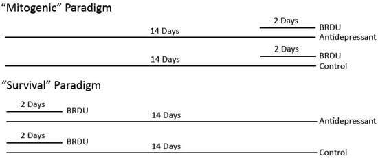 Experimental paradigms. The “survival” paradigm we developed calls for coadministration of BrdU for two days at the beginning of a 14-day treatment regimen with or without antidepressant drug, whereas the “mitogenic” paradigm calls for coadministration of BrdU for two days at the end of the 14-day treatment. Preliminary experiments indicated two days of BrdU administration would allow optimal labeling for our experimental design (data not shown). Two developmental stages of Sprague Dawley rats were tested: pre-adolescent (11–24 days) and adolescent (21–34 days).