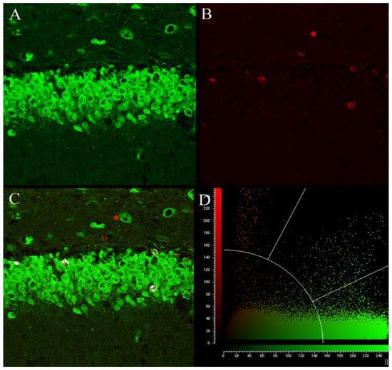 A quantitative neurogenesis assay was developed using colocalization of the fluorescent signal arising from BrdU and NeuN using confocal microscopy (Figure 3). The number of BrdU and NeuN double-labeled cells was quantified using a confocal scanning microscope (Leica DMI 6000B, Leica Microsystems, Deerfield, IL, USA). Excitation was achieved with a 488 nm Kr/Ar laser and a 594 nm He/Ne laser. Two separate photo multiplier tubes were used to scan for emissions at wavelengths 500 to 580 nm and 605 to 700 nm for the emissions from Alexa 488 and Alexa 594 fluorescent antibodies, respectively. Each of the eight sections collected per rat was examined for BrdU/NeuN colocalization rates. All BrdU-positive cells within one 246 μm2 field of view were examined for colocalized fluorescence with NeuN using a software colocalization tool (Leica LAS Advanced Fluorescence suite v.4, Leica Microsystems, Deerfield, IL, USA) which identifies and plots pixels with colocalized emission of different wavelengths above a specified intensity (Figure 3). The percentage of BrdU-positive cells expressing the NeuN neuronal marker was calculated as BrdU/NeuN-positive cells divided by the total number of BrdU-positive cells.