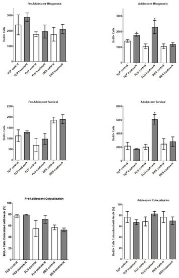 We determined whether chronic antidepressant drug treatment (14 days) changed the number of newborn cells in the “mitogenic” paradigm in pre-adolescent (days 11–24) and adolescent (days 21–34) rats. In this paradigm, newborn cells are marked with BrdU after 14 days of treatment. Tranylcypromine and desipramine dosing was based upon functional response in juvenile rats using the forced swim test [,]. Fluoxetine dosing was based upon functional response in the force swim test [] and other behavioral responses [] in juvenile rats. The antidepressant drugs from the three different classes did not significantly alter the birth of newborn cells after 14 days of treatment in pre-adolescent (days 11–24) rats (Figure 4, upper left panel). Very notably, fluoxetine did induce a significant increase in the number of newborn cells, i.e., increase the mitogenic rate, after 14 days of treatment in adolescent (days 21–34) rats (Figure 4, upper right panel). To a lesser extent, TCP induced a significant increase in the number of newborn, i.e., increase the mitogenic rate, after 14 days of treatment in adolescent (days 21–34) rats (Figure 4, upper right panel).