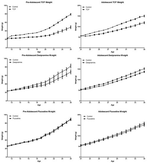 Growth of pre-adolescent (days 11–24) and adolescent (days 21–34) rats with chronic antidepressant treatment. TCP (10 mg∙kg−1∙day−1) or vehicle, fluoxetine (4 mg∙kg−1∙day−1) or vehicle, and desipramine (7 mg∙kg−1∙day−1) were administered once daily i.p. for 14 days. Values are expressed as means ± SE. Statistical analysis was performed with a two-way ANOVA based on a definition of p < 0.05 as significant. The growth curves were significantly different for pre-adolescent TCP (DF = 1, f = 8, p < 0.0001), adolescent TCP (DF = 1, f = 373, p < 0.0001), pre-adolescent desipramine (DF = 1, f = 37, p < 0.0001), adolescent desipramine (DF = 1, f = 87, p < 0.0001), and adolescent fluoxetine (DF = 1, f = 8, p = <0.005). The growth curves were not significantly different for pre-adolescent fluoxetine (DF = 1, f = 0.09, p = 0.76). The interaction between age and treatment was significant for TCP- and desipramine-treated rats (p < 0.0001) but was not significant for fluoxetine-treated rats (p > 0.05).