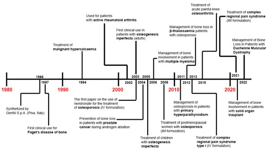 Finally, the efficacy of IV neridronate (the same treatment protocol as for CRPS type 1) has been also evaluated for acute pain relief in patients with knee osteoarthritis (KOA) and bone marrow lesions (BMLs) versus placebo [86]. Varenna et al. reported statistically significant pain relief at the end of the intervention in their neridronate group (−48.4%) that further improved 50 days later (−69.1%). Additionally, a statistically significant reduction in BML (i.e., whole-organ MRI score, WORMS, −41.1% in neridronate group) and pain killers use (12.9% vs. 72%) was reported in the intervention group versus placebo (in Figure 1 and Table 1 the history of the clinical use and main findings from clinical studies about neridronate are provided).