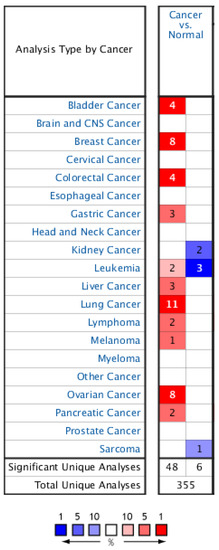 Differential mRNA level of HMGA1 in 20 types of cancer compared to matched normal tissue in the Oncomine. Significantly (p < 0.05) increased and decreased levels of HMGA1 are indicated in red and blue, respectively. The intensity of cell color is determined by the best gene rank percentile for the analyses within the cell. The number in each cell represents the number of analyses that meet the given thresholds within the analysis and cancer types.
