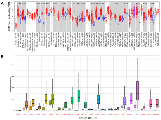 HMGA1 expression levels in different cancer types compared to the corresponding normal tissue: (A) TIMER2.0; the statistical significance (p-value) computed by the Wilcoxon test is annotated by the number of stars: * p < 0.05; ** p < 0.01; *** p < 0.001; box plots in grey columns indicate cancer types where data for matched normal tissue was available; red and blue box plots indicate tumor and normal samples, respectively (B) TNMplot; cancer names where differences with p < 0.01 was detected are typed in red.