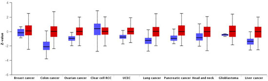 The HMGA1 protein levels in different cancer types compared to normal tissues investigated by UALCAN. Blue and red box plots indicate normal and tumor samples, respectively.