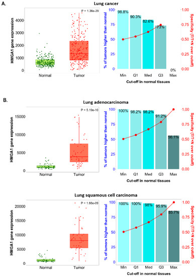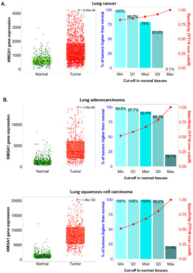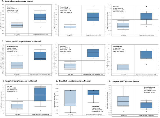 The Oncomine database [53] (https://www.oncomine.org, accessed on 1 January 2022) was used: (1) to analyze the HMGA1 mRNA expression level in a variety of human cancers, where threshold settings were as follows: gene ranking of the top 10%, change ≥ 2, p-value ≤ 1 × 10−4, and (2) to screen HMGA1 mRNA expression level in different histological subtypes of lung cancer. All statistical methods and statistical values were obtained directly from the mentioned database.