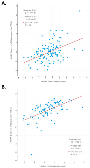 The study also examined whether an increase in HMGA1 mRNA expression in lung cancer is followed by an elevation of HMGA1 protein. Indeed, statistically significant correlations found between mRNA expression score and protein abundance for lung cancer data collected by cBioPortal. An increase in HMGA1 mRNA level was associated with a proportional gain in the HMGA1 protein amount in both lung adenocarcinoma (R Spearman 0.40, p < 0.001; R Pearson 0.45 p < 0.001; Figure 7A) and lung squamous cell carcinoma (R Spearman 0.61, p < 0.001; R Pearson 0.54, p < 0.001; Figure 7B).