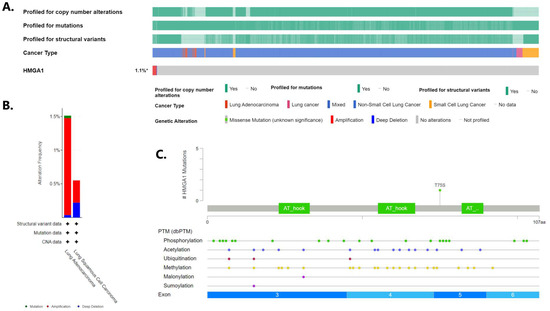 Genomic alterations of HMGA1 in lung cancer according cBioPortal. (A) Oncoprint of the HMAG1 in lung cancer, (B) Incidence of different alterations according to NSCLC types, (C) Details of HMGA1 missense mutation found in lung adenocarcinoma.