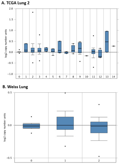 HMGA1 copy number in normal lung tissue and different histological subtypes of lung neoplasm by Oncomine: (A) TCGA lung 2: 0. normal lung (n = 810), 1. acinar lung (n = 6), 2. lung adenocarcinoma (n = 261), 3. lung adenocarcinoma, mixed subtype (n = 67), 4. lung clear cell adenocarcinoma (n = 2), 5. lung mucinous adenocarcinoma (n = 6), 6. micropapillary lung adenocarcinoma (n = 3), 7. mucinous bronchioloalveolar carcinoma (n = 3), 8. non-mucinous bronchioloalveolar carcinoma (n = 9), 9. papillary lung adenocarcinoma (n = 10), 10. solid lung adenocarcinoma (n = 1), 11. squamous cell lung carcinoma (n = 348), 12. squamous cell lung carcinoma, basaloid variant (n = 8), 13. squamous cell lung carcinoma, papillary variant (n = 2), 14. squamous cell lung carcinoma, small cell variant (n = 1); (B) Weiss lung: 0. normal lung (n = 59), 1. lung adenocarcinoma (n = 77), 2. squamous cell lung carcinoma (n = 155).