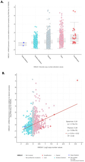 Association between HMGA1 mRNA expression level and (A) discrete copy number alterations, (B) log2 copy-number value (generated by cBioPortal).