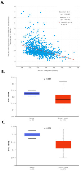(A) Correlation between the mRNA expression level and DNA methylation profile of the HMGA1 in lung cancer by cBioPortal; the promoter methylation level of the HMGA1 in (B) lung adenocarcinoma and (C) lung squamous cell carcinoma tissue in comparison with normal lung tissue by UALCAN.
