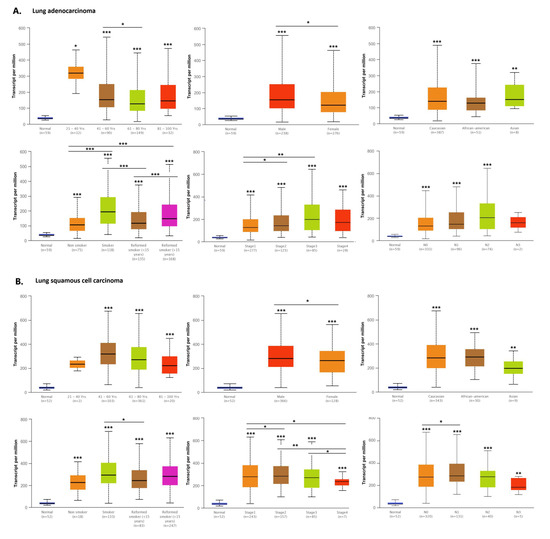 Many factors, including the extent of the spread of neoplastic cells in the body or their histological differentiation, affect the outcome of lung cancer patients. Therefore, to evaluate the clinical significance of the HMGA1 expression level in lung cancer, HMGA1 expression level was compared with selected clinicopathological features: age, sex, population affinity, smoking status, TNM stage, and nodal involvement separately in lung adenocarcinoma (Figure 12A) and squamous cell carcinoma (Figure 12B) with the usage of the UALCAN database.