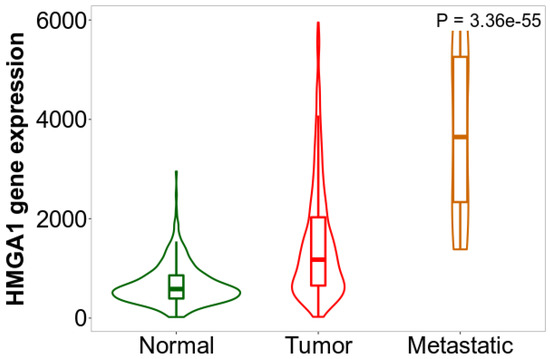 The Gene_DE module of the Tumor Immune Estimation Resource 2.0 [54] (http://timer.cistrome.org, accessed on 1 January 2022) was used to study the differential expression between tumor and adjacent normal tissues for HMGA1 gene across TCGA tumors. The distributions of gene expression levels are displayed using box plots. The statistical significance (p-value) was computed by the Wilcoxon test.